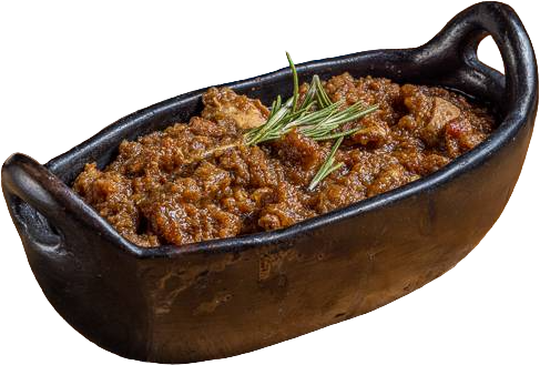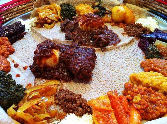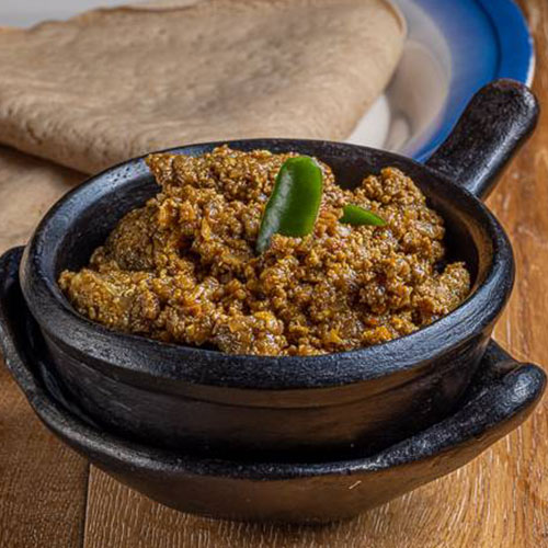 Plat à base d'injera et de viande séchée de boeuf, mariné dans une sauce aux oignons, tomates et savoureuses épices.