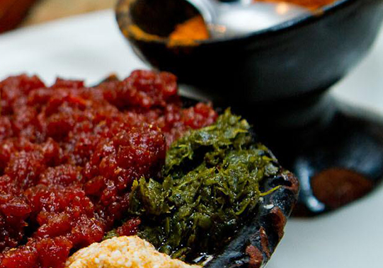 Gomen "épinards épicés et hachés, cuits aux herbes avec des oignons et divers poivres".